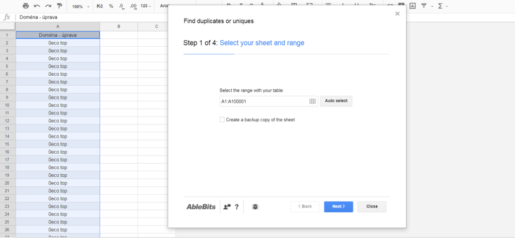 - Jelikož z jedné domény může pocházet více zpětných odkazů, je nutné smazat duplicitní buňky. Bohužel Spreadsheets neobsahují funkci na odstranění duplicitních buněk, je nutné stáhnout doplněk nebo použít Excel (my se stále budeme držet postupu v Google Tabulkách).