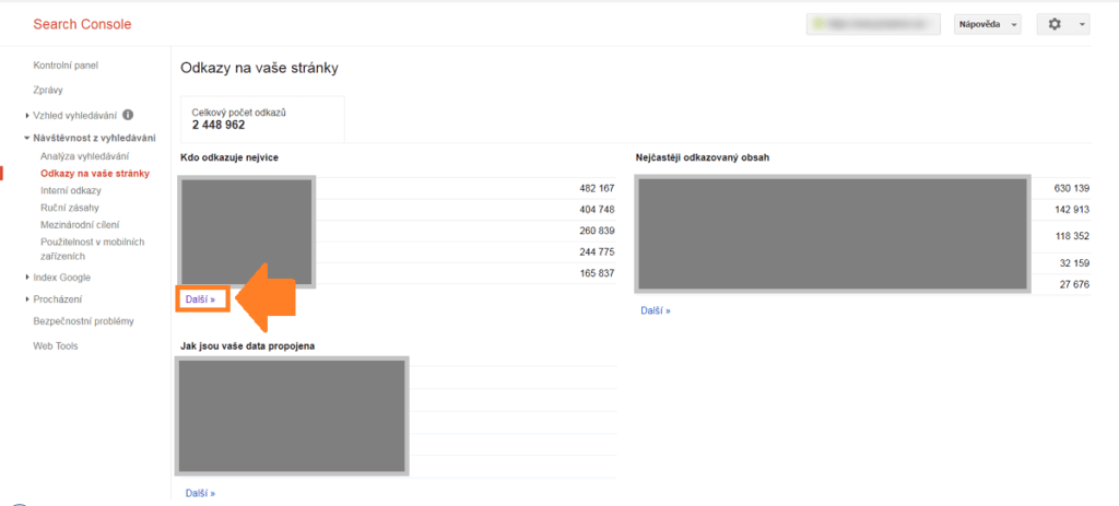 - V levém menu vyberte “Návštěvnost z vyhledávání” a poté “Odkazy na vaše stránky”