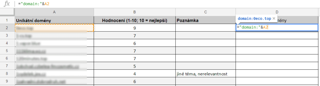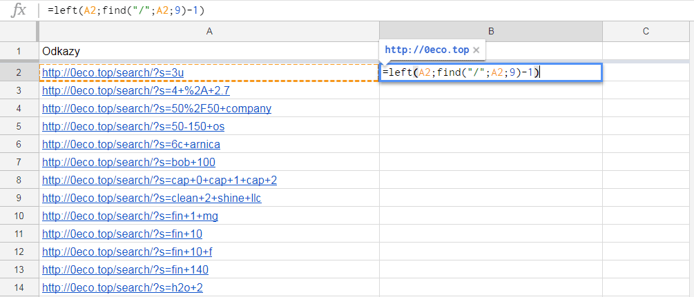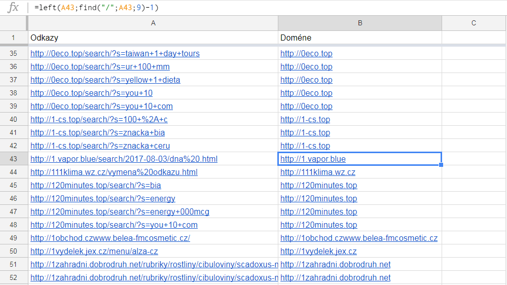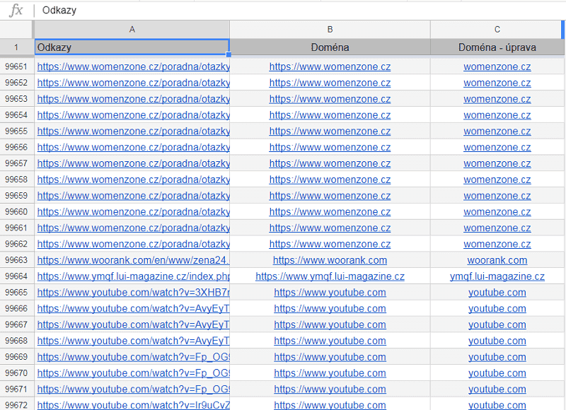 Naším dalším úkolem bude sjednotit URL adresy do stejného tvaru (do podoby domény). Ano, toto bychom nemuseli, kdybychom si vyexportovaly jiný dokument nebo využili placené nástroje. Nicméně tento krok jsem udělal kvůli 2 hlavním věcem – mám dokument s jednotlivými URL adresami, kde se zpětný odkaz nachází a mohu si procvičit práci s daty 🙂 ´Tak tedy hlavně ty URL adresy – pokud používáte jeden z placených nástrojů, pak si jednoduše přes zjistíte další podrobnější údaje o všech odkazech. Pokud máte odkazů málo, můžete přeskočit tuto část a věnovat se už rovnou hodnocení konkrétních referujících URL adres. I tak se budu držte připraveného návodu, kdy je naším úkolem distancovat se od nejzávažnějších celých domén. Tudíž by se dalo říci, že jsme si přidali práci, ale návod tak pomůže lidem využívající placené nástroj pro analýzu odkazového profilu.