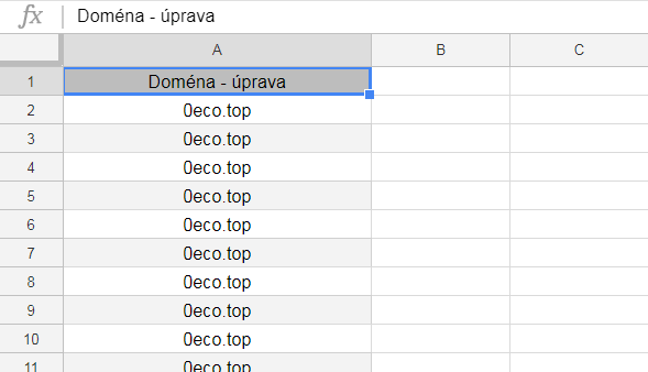 - Do tohoto listu zkopírujte z předešlého listu z GSC sloupec, který jsme si pojmenovali “Doména – úprava”Do nového listu si nakopírujte celý sloupec s upravenými doménami.