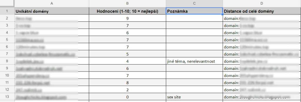 Nyní vás čeká ruční projití webových stránek, abyste měli plnou kontrolu nad tím, od čeho se budete chtít distancovat. Doporučuji si vytvořit alespoň další sloupec pro poznámky k jednotlivým doménám a určitě nezapomeňte na sloupec se samotným hodnocením. Projděte tedy doménu po doméně (proto se postup hodí, pokud máte méně zpětných odkazů, kdy je ruční metoda ještě efektivní). Chce to chvíli praxe, protože i web na první pohled nehezky vypadající může pro vás být přínosný.