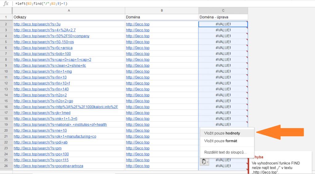- Vyberte celý sloupec, ve kterém se objevují domény vytvořené skrze naši funkci. Bude důležité tento sloupec zkopírovat a vložit domény do nového sloupce. Jde totiž o to, že na sloupec, kde byla využita funkce, nemůžeme aplikovat funkci “Najít a nahradit”.
